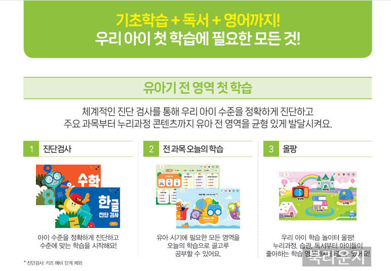 무료 체험 시 한글/수학진단, 유아문해력진단, 부모 양육태도과 함께 누리과정 필수독서 2권을 함께 드립니다.