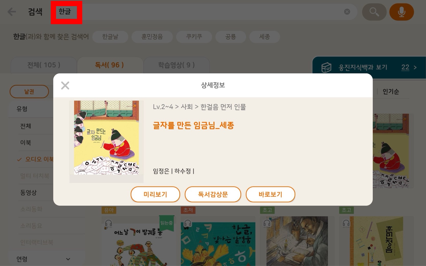 자 “한글” 이라고 검색음에 드는 책을 바로보기 해 볼까요?